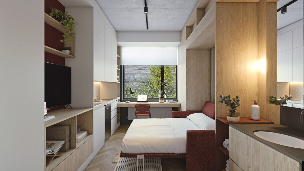 Includes a double bed and smart TV. Kitchenette comes with utensils, hob & fridge. Full en-suite, WFH desk, ample storage, valuables safe.